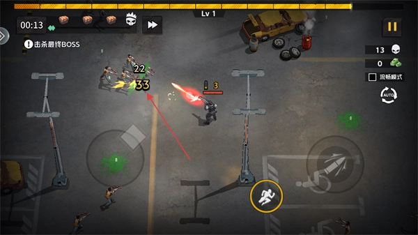 当四面八方涌来感染者时,点击攻击按钮发射子弹将其击杀,同时留意屏幕上显示的敌人血量数值。