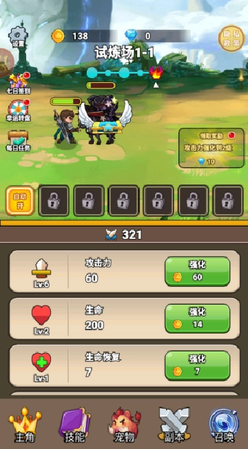 挑战金币钻石等各样副本,获得每天的资源奖励。