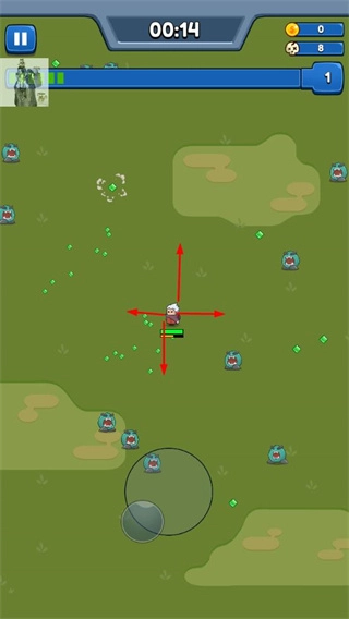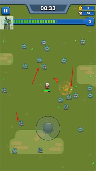 在游戏地图里操控角色移动,收集绿色晶体这类资源,与此同时攻击蓝色怪物,以此来提升角色等级。