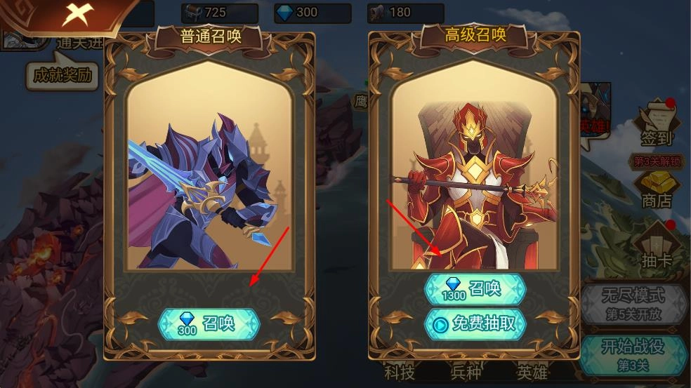 通过普通召唤和高级召唤获取英雄,扩充战力阵容。