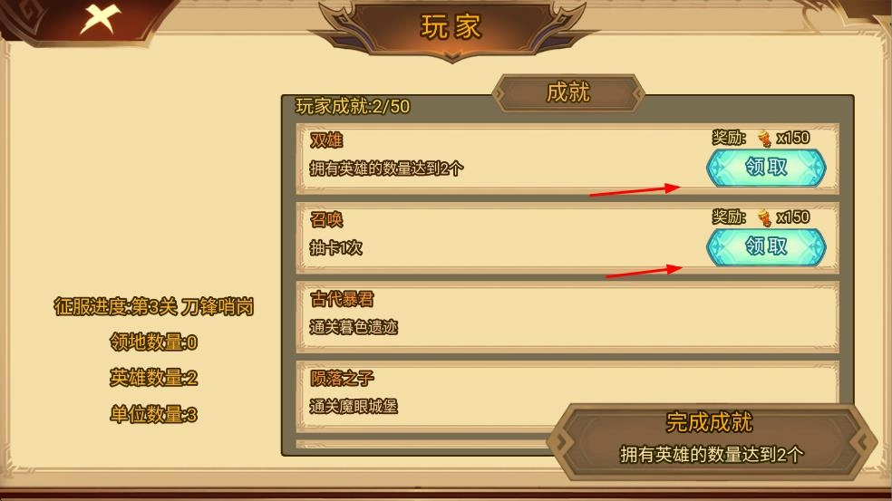 完成双雄、召唤等成就任务,领取资源奖励,积累养成材料。