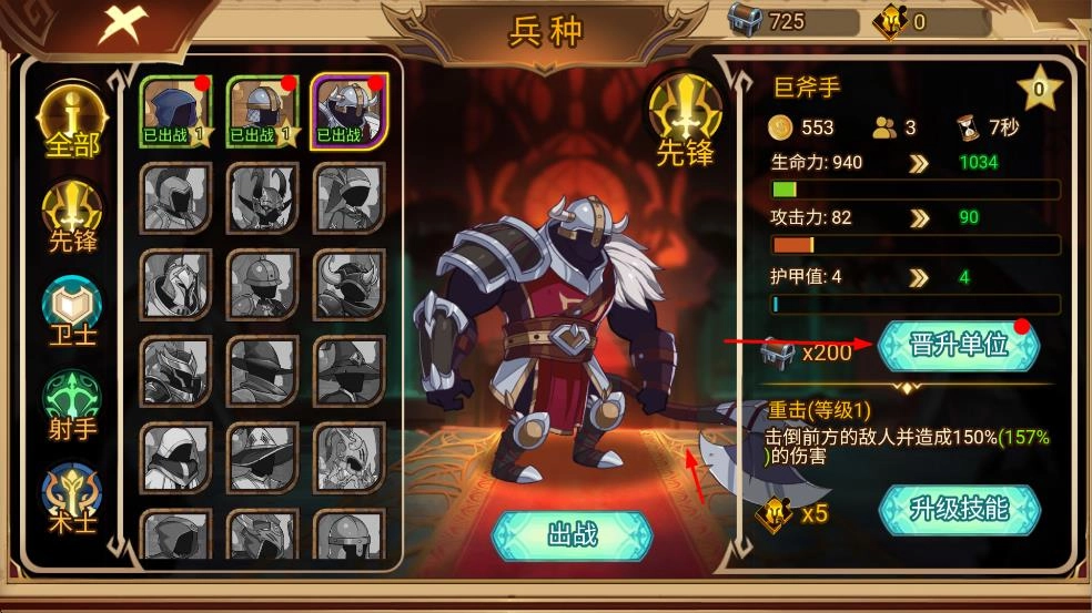 在兵种界面进行单位晋升与技能升级,以此提升生命值、攻击力等各项属性,从而强化部队的整体战力。