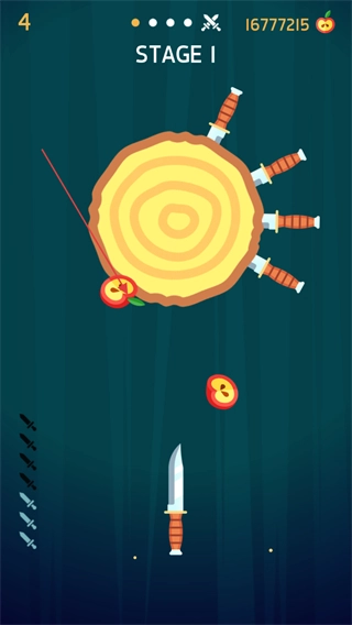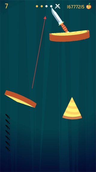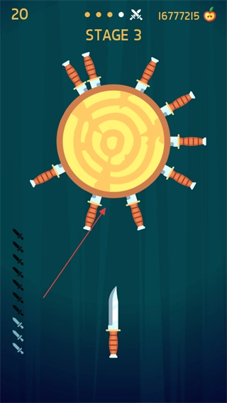 木盘上插着几把飞刀,玩家需要瞄准盘上剩下的空隙继续投掷,以此增加插入的飞刀总数。