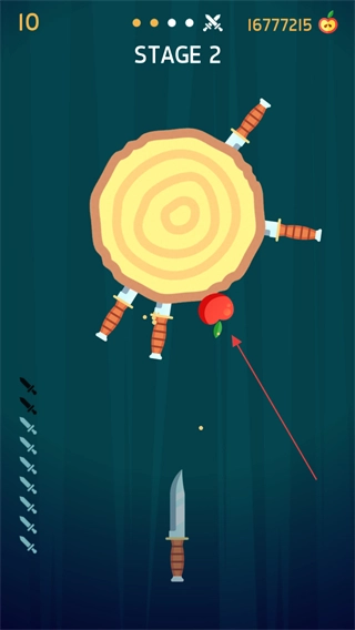 STAGE1开启,对准旋转的木盘,找到合适的空隙将飞刀发射并插入木盘。