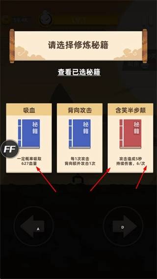 挑选修炼秘籍,其中包含吸血、背向攻击、含笑半步颠等,能够助力提升战斗能力。