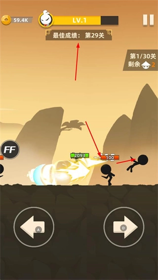 在战斗场景里,玩家操控火柴人对敌人发起攻击,以此推进关卡进度;界面会呈现出最佳成绩等关卡相关信息,从而激励玩家去挑战更高级别的关卡。