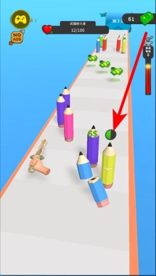 在游戏中进行武器战斗时,首先要锻造出合适的武器,之后进入关卡场景。在关卡里,你需要操控武器去击打像彩色铅笔这类障碍物,只要在规定时间或满足特定条件的情况下完成击打任务,就能顺利推动游戏进程。