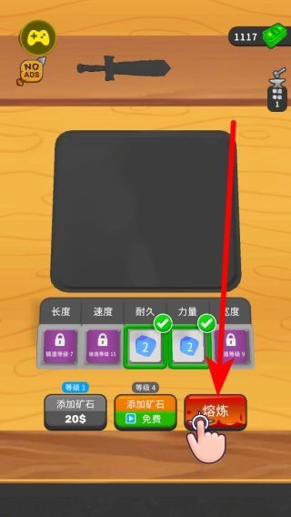 矿石熔炼时,只要拥有对应等级的矿石,点击熔炼按钮,矿石便会在熔炉里进行熔炼,完成这一步后,就可以逐步打造出武器的雏形了。