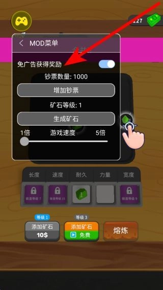通过菜单功能,你可以开启领奖励等选项,以此获取钞票、生成矿石等资源,同时还能调整游戏速度,让游戏体验更加流畅。
