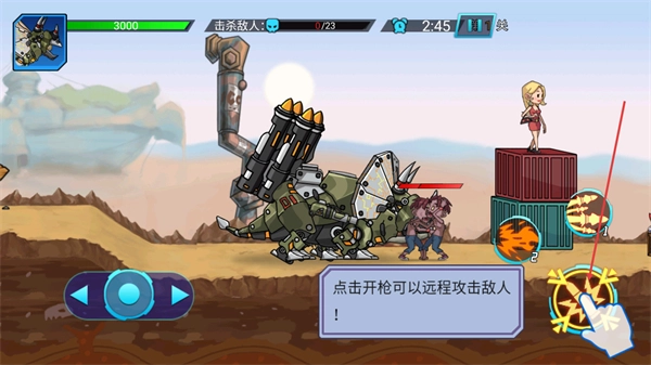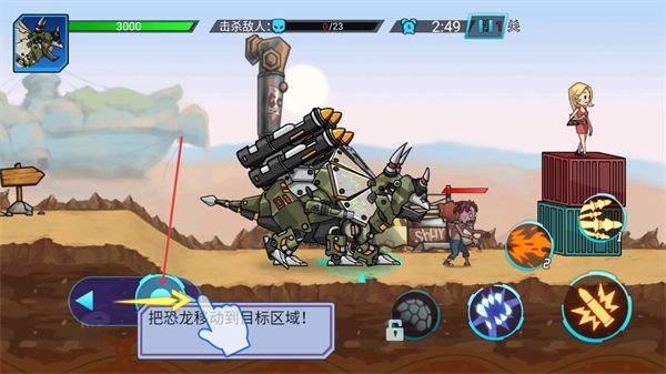 1、第1关界面里请依照提示操作移动按钮,把恐龙移至目标区域,这是开启关卡流程的必要步骤,完成这一步后就能着手进行击杀敌人的任务了。