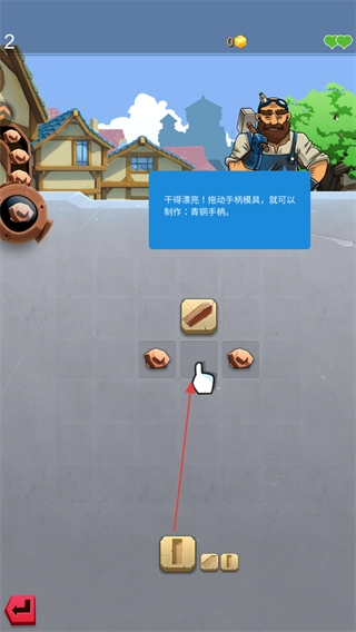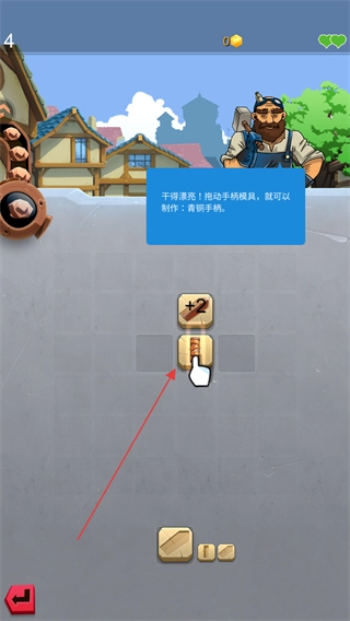 拖动手柄模具,搭配现有的道具来制作青铜手柄,以此推动装备打造的进程。