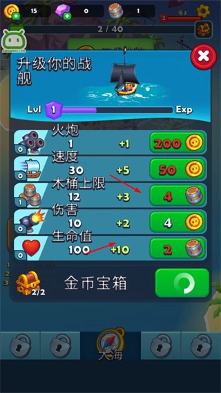 进入战船升级界面后,你可以消耗金币、木桶等资源,对舰船的火炮威力、航行速度、木桶容量上限等各项属性进行升级强化。