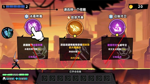 在战斗进行时,你会得到技能选择的机会,可以从冰霜附魔、致命节奏、召唤守卫这类技能里进行挑选,每一种技能都有着独特的效果,能够为战斗提供帮助。