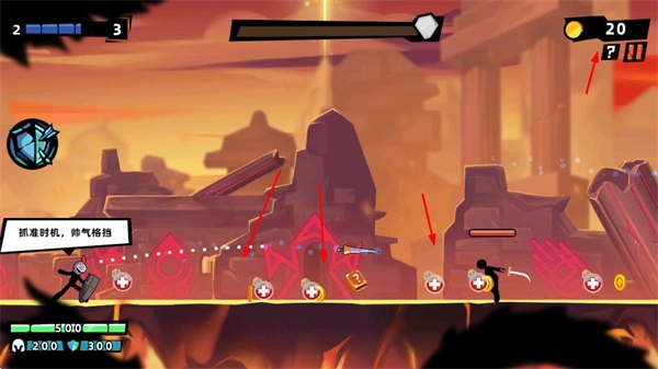 在关卡里,要把握好时机施展格挡之类的操作,与此同时收集场景里的道具、金币这类资源,以此增强自身能力或者获得收益。