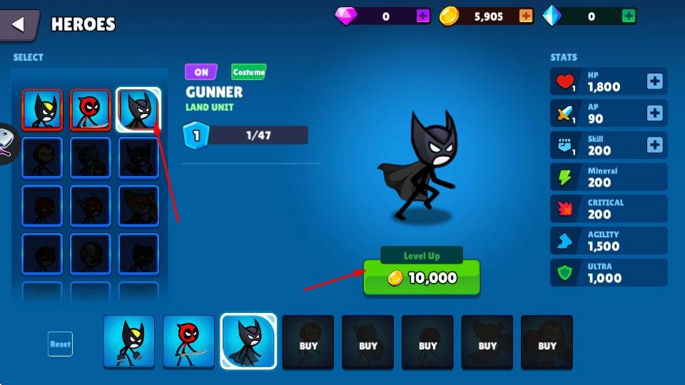 在英雄界面中,你能够挑选不同的英雄,消耗金币来提高英雄的等级,从而强化英雄的各项属性。