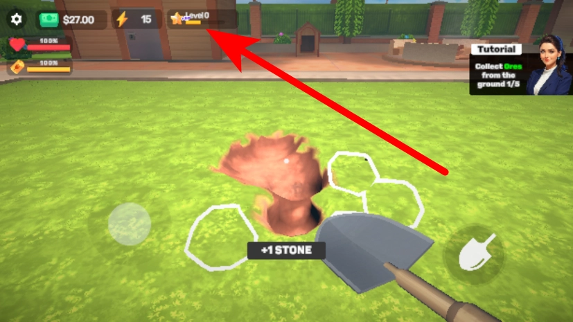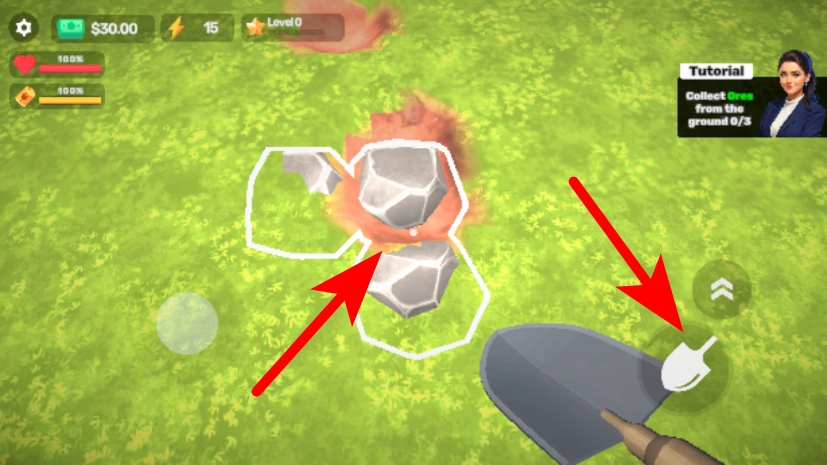 2、在目标区域,点击道具按钮,挖掘地面获取石块。
