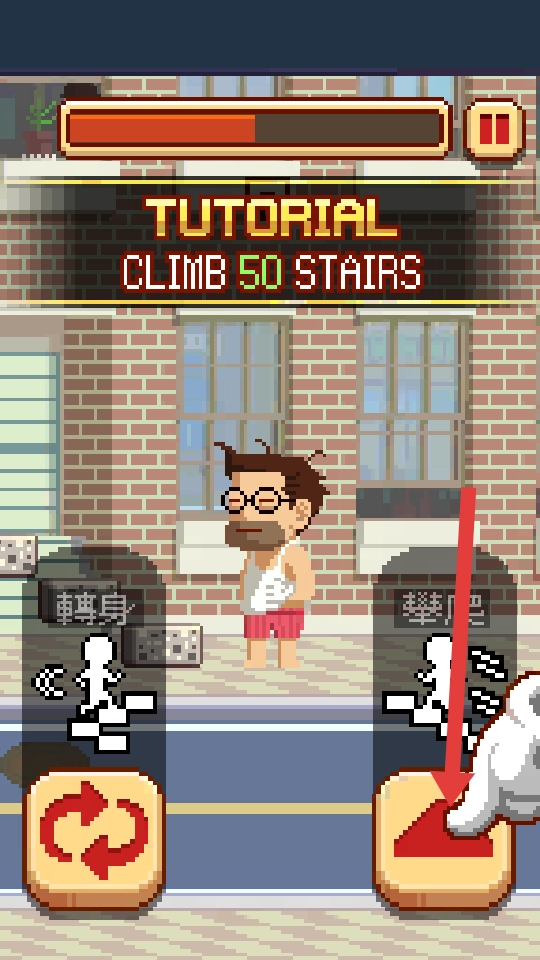 在像素风格的爬楼游戏里,教程任务要求玩家攀爬50级台阶,点击右侧的攀爬按钮就能操控角色向上移动,这是完成任务的基础操作。