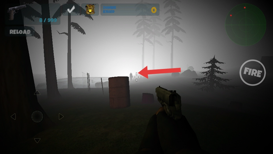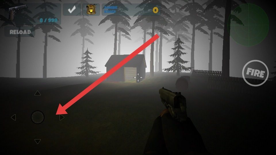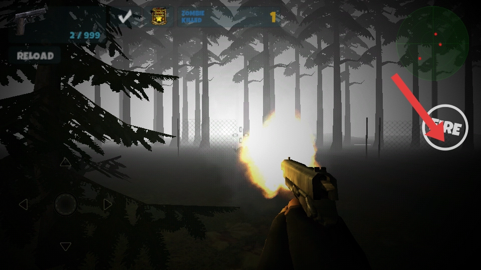 用虚拟摇杆操控角色移动,在阴森的森林场景里展开探索,搜寻僵尸的踪迹,为接下来的战斗做好准备。