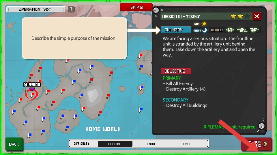 在战术射击游戏的任务选择界面,查看Mission01-Rising的任务目标,主要任务是消灭所有敌人和摧毁4个炮兵单位。
