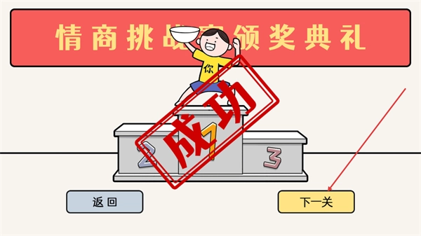 4、关卡完成后进入情商挑战颁奖典礼成功界面,点击界面中的下一关按钮,即可进入后续关卡继续参与挑战。