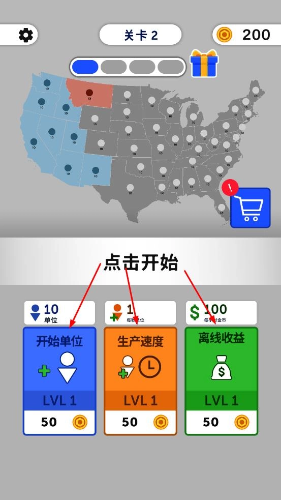 在关卡准备界面,玩家可以消耗金币对开始单位、生产速度、离线收益等模块进行升级,以此提升初始兵力、资源生产效率以及离线收益,从而为区域争夺积累优势。