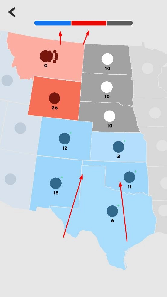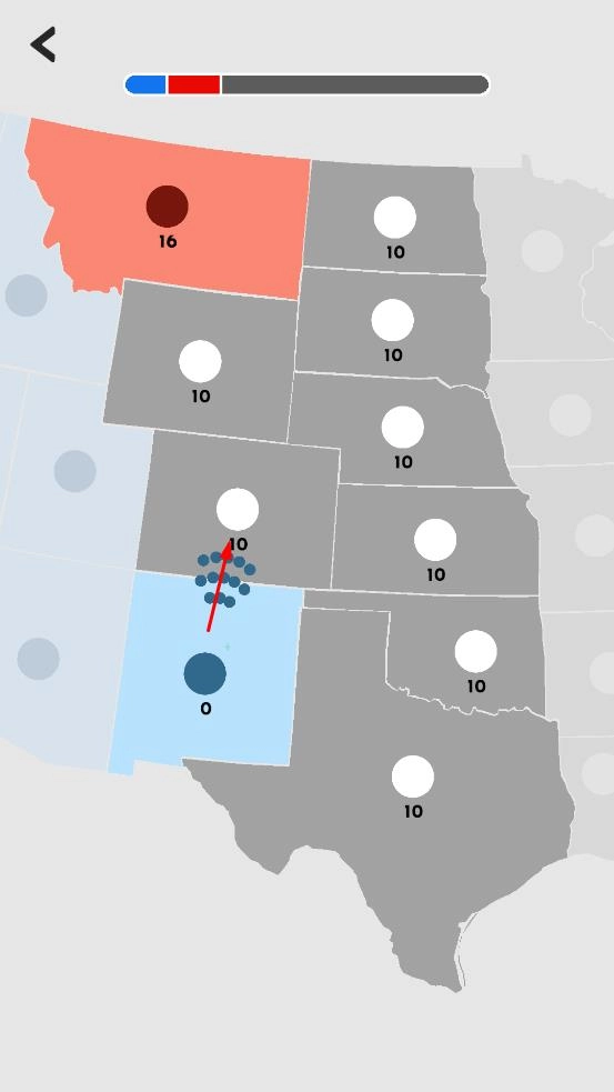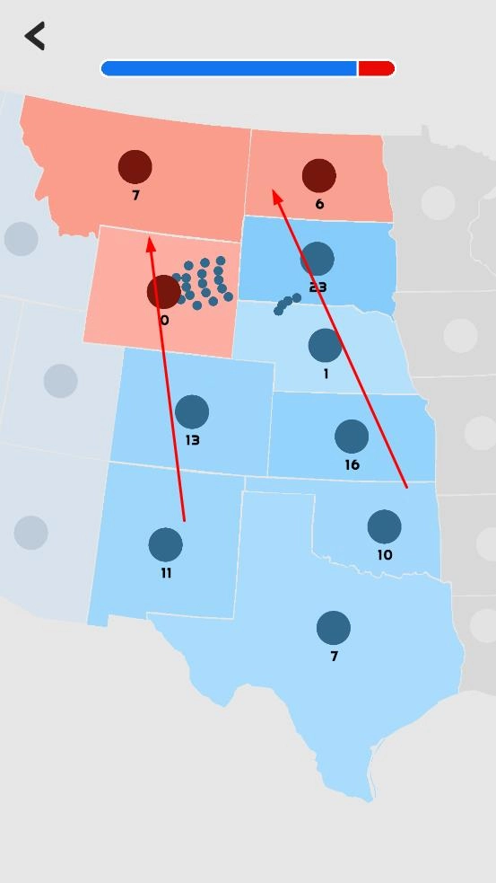 进入以美国地图为场景的对战环节,操控己方蓝色阵营单位向敌方红色阵营区域发起进攻,争夺地图上标注数值的区域控制权。