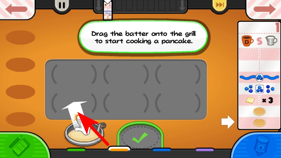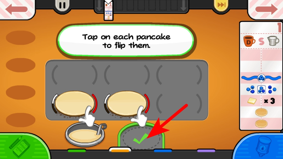 2、面糊煎至半熟后,紧跟红色箭头指引,点击每个煎饼进行翻面,确保煎饼均匀受热熟透,完成环节。