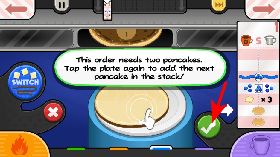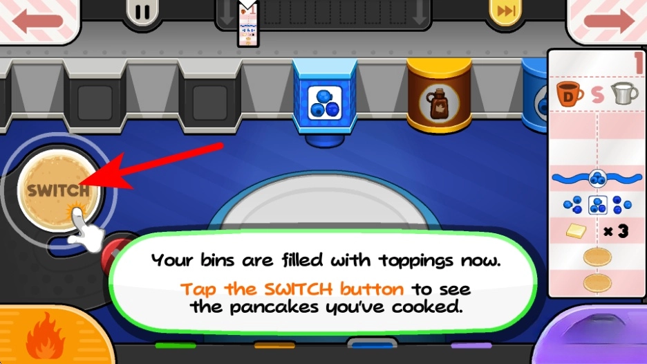3、烹饪完成后,依照红色箭头指引,点击SWITCH按钮切换到配料工位,查看已烹饪好的煎饼,准备添加。