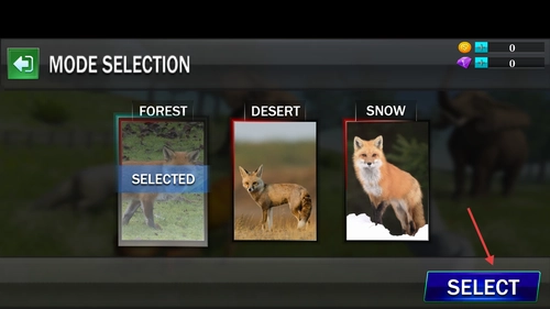 进入游戏主界面后选择生存模式,接着在场景列表里点击FOREST选项,就能正式开启北极狐的森林冒险之旅了。