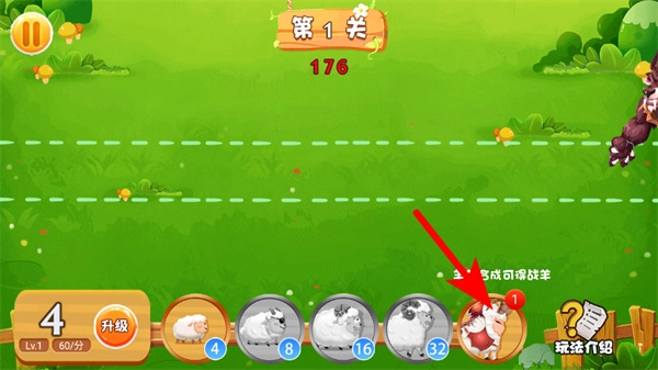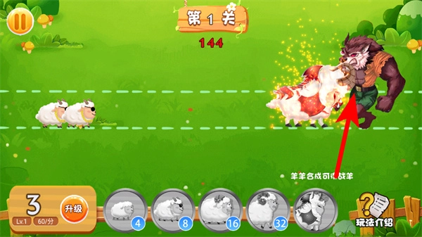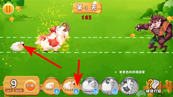 2、在第1关界面,依照红色箭头指引,点击对应战羊的解锁区域,获取更强的战羊单位以提升战斗能力。