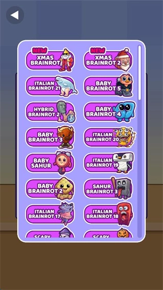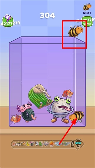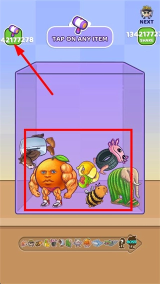 角色设计充满脑洞,从戴皇冠的小人,到长肌肉的橙子、仙人掌大象,每个角色都走奇葩反差路线,造型夸张搞笑,视觉上极具魔性吸引力,每一次合成都会带来新的奇葩惊喜。核心玩法是投放相同角色→合成新角色,操作仅需点击,逻辑简单易上手,但合成未知奇葩角色的期待感,搭配容器堆叠的视觉反馈,极易让人沉浸其中,形成停不下来的游玩节奏。紫色容器是固定的堆叠空间,投放、合成角色时需要考虑布局,既要让相同角色靠近方便合成,又要避免容器过早被堆满,让玩法多了一层策略性。合成角色会积累分数,分数达标后可解锁更多新角色元素,从基础蜜蜂、小人,到肌肉橙子、奇葩动物,解锁的角色越奇特,游玩的新鲜感越强。