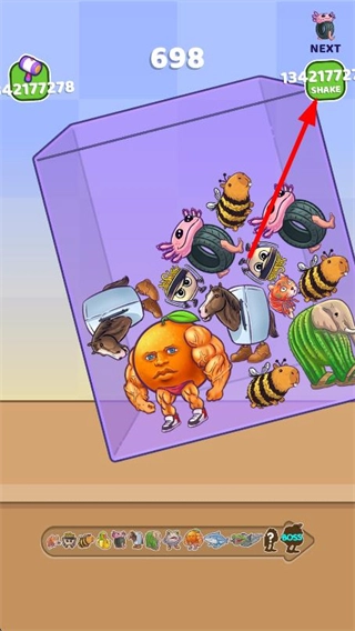 4、点击右上角的道具,可以摇晃容器,合并相同的角色。