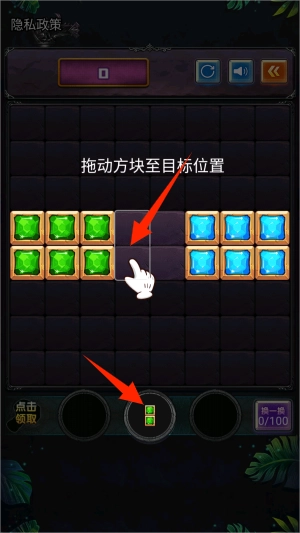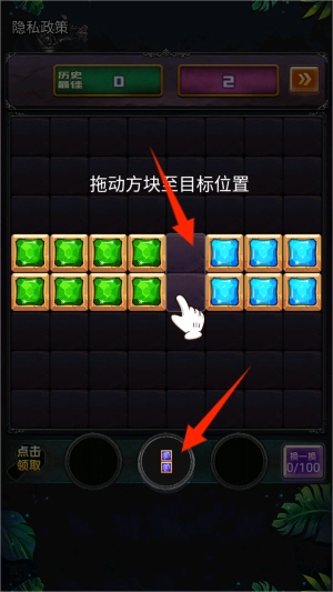 1、下方圆圈区域将随机出现不同颜色与形状的俄罗斯方块,你可以拖动方块至指定的目标位置。