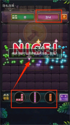 3、当横向或者纵向的格子被全部填满时,就会自动消除,连续消除的话得分会更高哦。