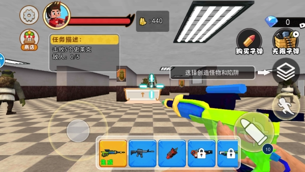 武器栏里有多种装备可供随时切换,玩家还能布置减速陷阱之类的道具,以此辅助完成剿灭任务。