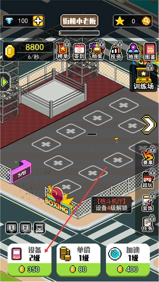 1、在不打街机不回家的主界面中,点击底部的设备2级按钮,消耗350金币即可升级设备,提升机厅的运营相关能力,后续还能解锁更多功能。