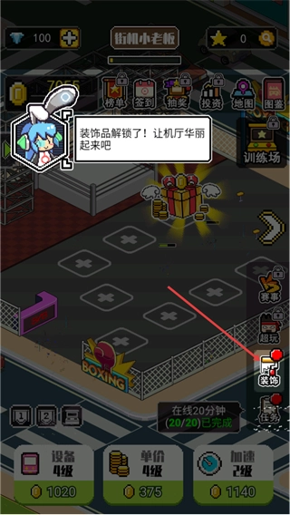 2、当界面出现装饰品解锁了,让机厅华丽起来吧的提示后,点击右侧的装饰按钮,即可进入装饰界面,为机厅配置装饰元素。