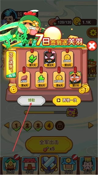 1、在7日签到送关羽的活动界面中,点击领取按钮,即可获取第1天对应的签到奖励,参与该签到活动可逐步解锁后续奖励。