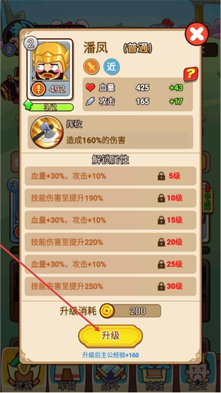 3、在潘凤的武将详情界面,点击升级按钮,消耗200金币,即可提升该武将的等级,同时增加其对应属性。