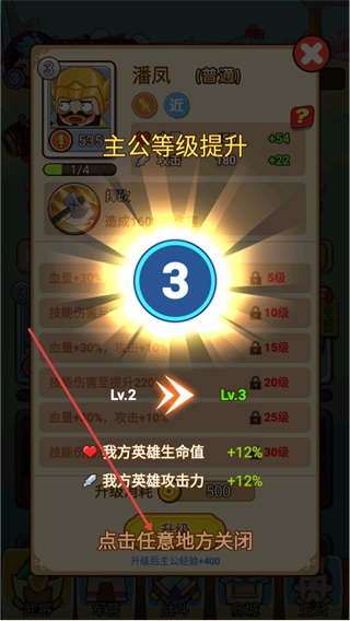 4、武将升级后出现主公等级提升的提示界面,点击该界面任意位置,即可关闭提示并返回武将详情界面。