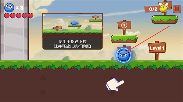 2、在游戏关卡里,按照提示用手指向下拉动蓝色球再松开,就能操控它完成跳跃动作,从而推动关卡的进程。