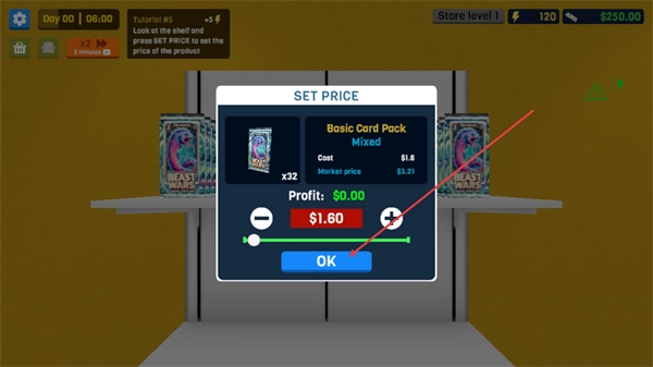 2、进入SETPRICE界面后,查看BasicCardPackMixed的成本与市场价,调整价格后点击OK按钮,完成该商品的定价设置。