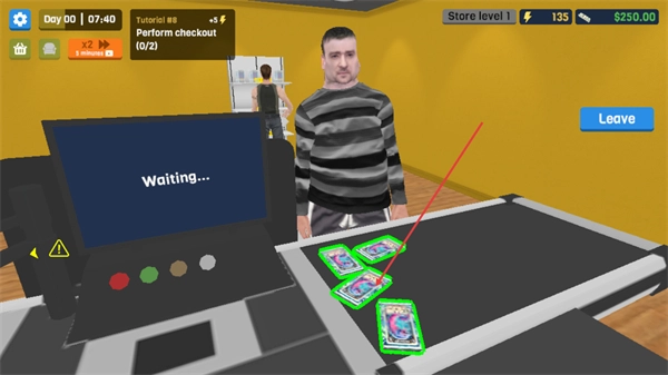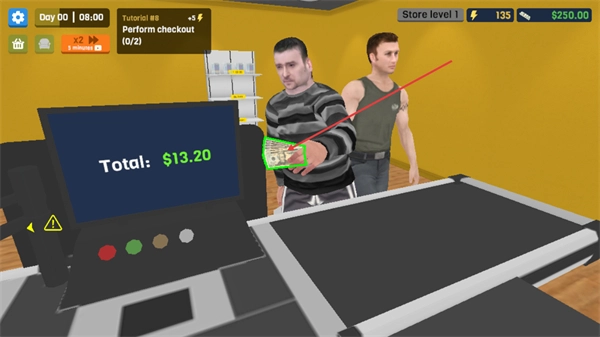 3、在收银台区域,针对顾客放置的商品,按照Tutorial的要求,执行结账操作,推进交易流程。