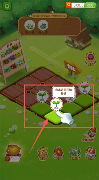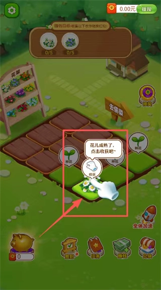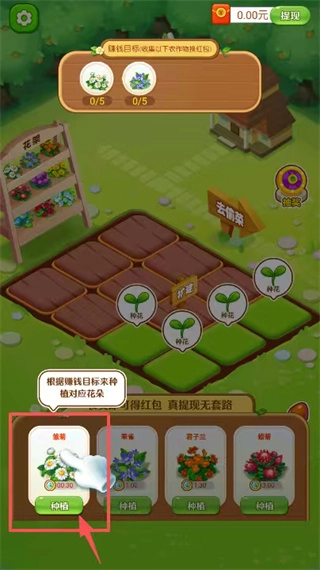 按照任务要求挑选指定品种的花朵来种植,点击底部的花卉图标就能完成栽种操作,等生长倒计时结束之后,就可以收获作物并领取红包奖励了。