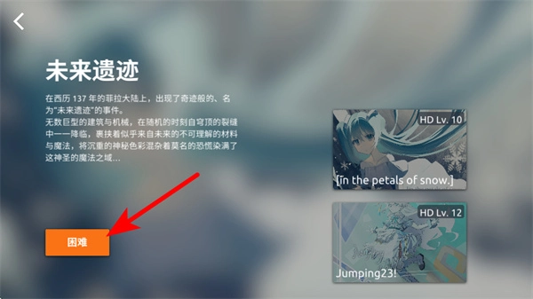 2、在关卡列表中,点击红色箭头指向的困难按钮,选择对应难度的关卡开始挑战。