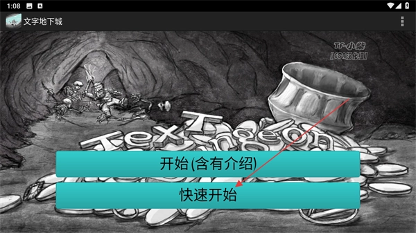 1、进入文字地下城的启动界面后,你可以选择带有介绍功能的选项来了解玩法,也能点击快速开始按钮直接进入地下城的探索环节。