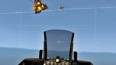 2.切换至第一人称视角,通过座舱内的瞄准系统锁定空中敌机,发射武器并观察爆炸效果,完成空战任务。