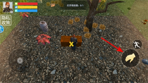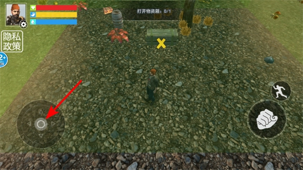 1、操控方向按钮移动角色,这是探索场景的关键操作,移动后可让角色接近场景内的物资箱,为后续的资源获取做准备。