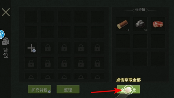 3、点击全部取出按钮收纳物资,这是整理资源的核心操作,取出后可将物资箱内的道具转移至背包,为生存制作提供材料。