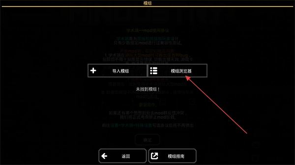 2、进入模组页面后,点击模组浏览器按钮,可进入模组列表界面,查看游戏支持的各类第三方模组。